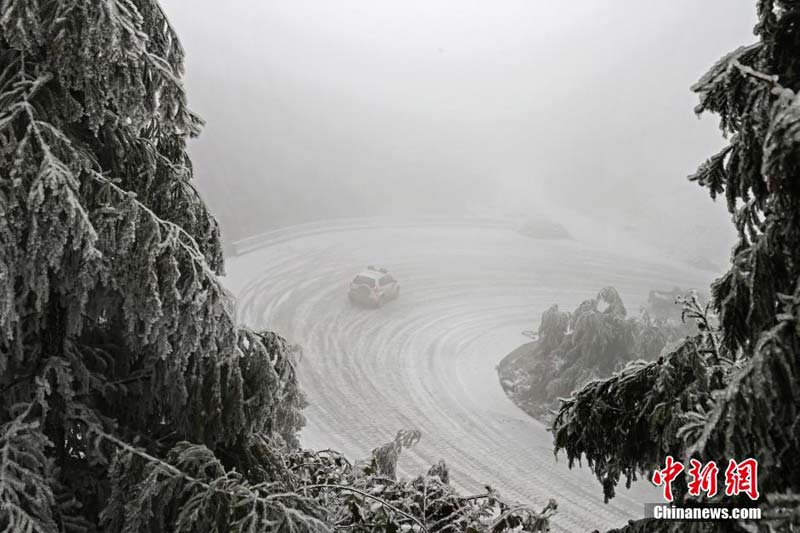 12月29日,贵州省六盘水市102省道梅花山路段温度降至零下6.2度,道路结冰达3厘米,严重影响车辆通行。六盘水市交警支队梅花山交警大队及时采取措施,对道路进行临时交通管制。中新社发 谭英学 摄