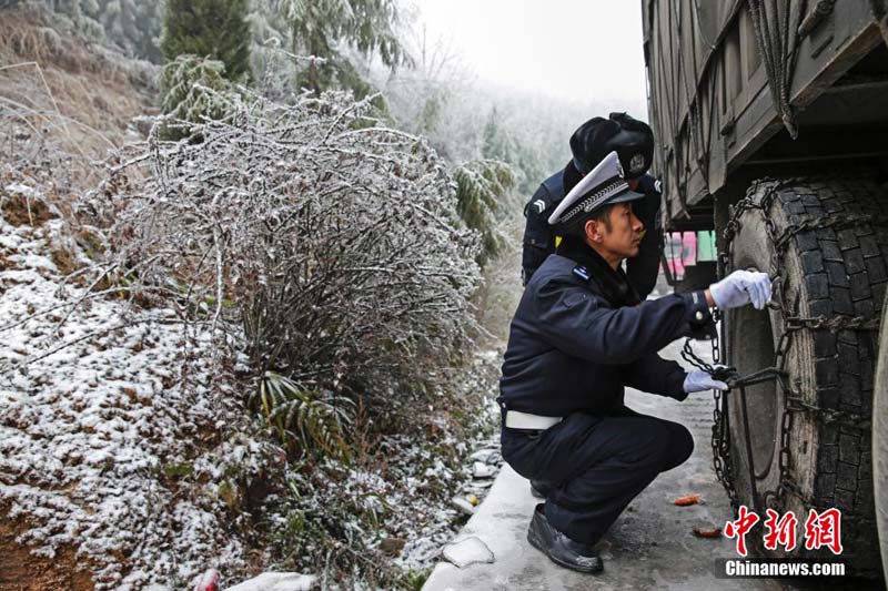 12月29日,贵州省六盘水市102省道梅花山路段温度降至零下6.2度,道路结冰达3厘米,严重影响车辆通行。六盘水市交警支队梅花山交警大队及时采取措施,对道路进行临时交通管制。中新社发 谭英学 摄