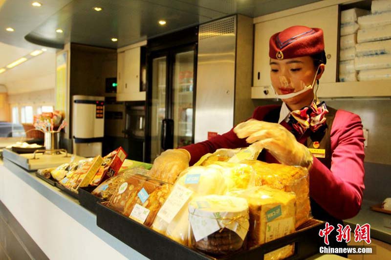 在刚刚开行的成都至利川D2262次动车上推出了茶餐厅特色服务,设在列车中部餐吧车的茶餐厅,为旅客准备了微波披萨、意大利面、日式饭团、寿司卷、美味面包等多项食物选择,增配饮料机供应奶茶、咖啡、果珍等浓香热饮,伴着优美的音乐和温馨的环境,这里成为旅客旅途用餐的理想场所。图为乘务员为旅客热情介绍售卖食品饮料。胡志强 摄