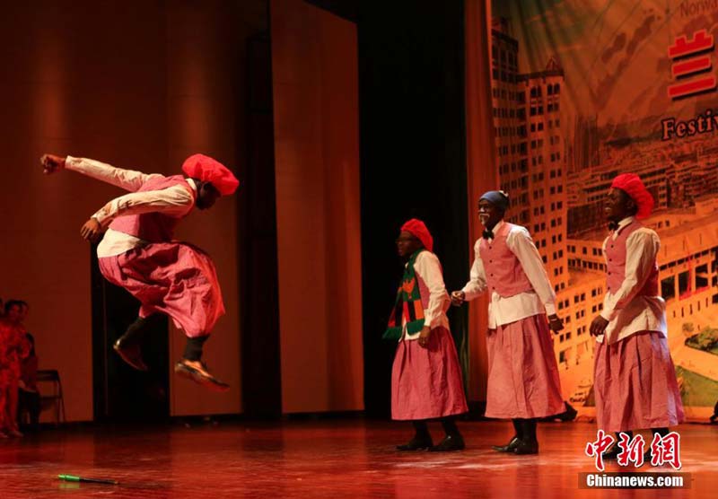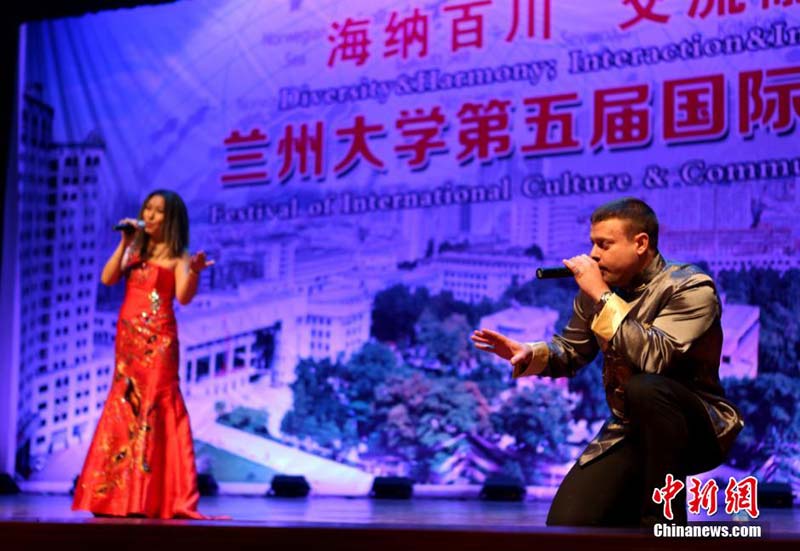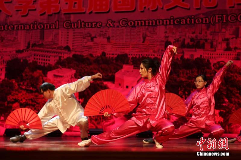 12月30日,兰州大学邀甘肃高校来华留学生共同举办国际文化节。当日,各国留学生亲手制作本国特色饮食与中国学生一起迎接即将到来的新年。留学生还制作各国服饰形象展板置于广场供参与者拍照,并推出一台中西结合的文艺节目。图为中国学生与哈萨克斯坦学生合演太极扇。闫雅琪 摄