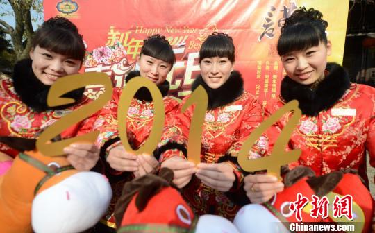 2014新年即将到来,12月30日,被誉为“晚清第一园”,又名“寄啸山庄”的扬州何园开展了“快乐拼马年”新年活动,在何园担任导游的一些“何园千金”自制个性马年生肖“2014”字样,共迎接新年到来。