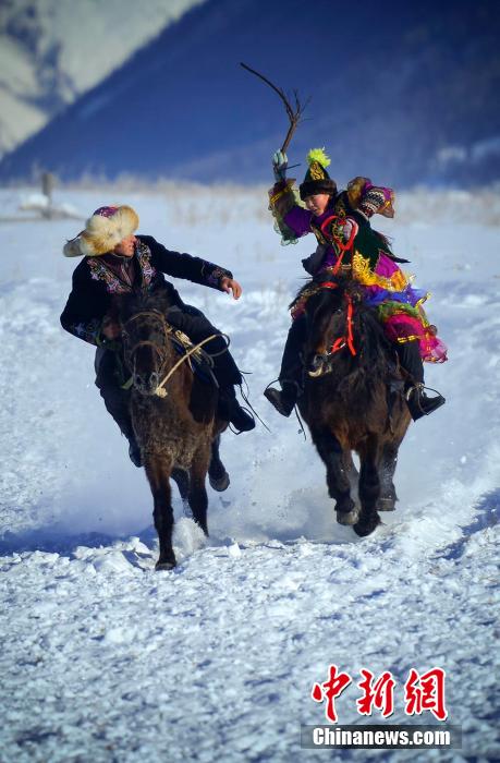 2014年1月1日,新疆喀纳斯第七届冰雪风情旅游节在该景区禾木村观景平台举行,众多游客乘坐马拉爬犁前往活动举办地,观看古老毛皮滑雪、雪地赛马、雪地拾银、雪地射箭、姑娘追、锯木头、抱石头等当地淳朴的民俗表演。冬季的喀纳斯银装索裹、冰清玉洁。喀纳斯景区是蒙古族图瓦人在中国唯一的聚集地,被誉为人类游牧文化的博物馆,至今依然保留着传统的生产生活方式,被誉为“云间部落”、“林中百姓”。图为雪地叼羊。刘新 摄