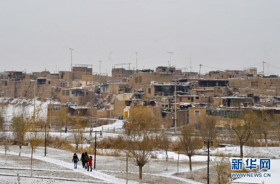 1月8日,在喀什市高台民居景区,市民踏雪前行。当日,地处新疆塔克拉玛干大沙漠西缘的喀什市降下新年初雪。 新华社记者 赵戈 摄