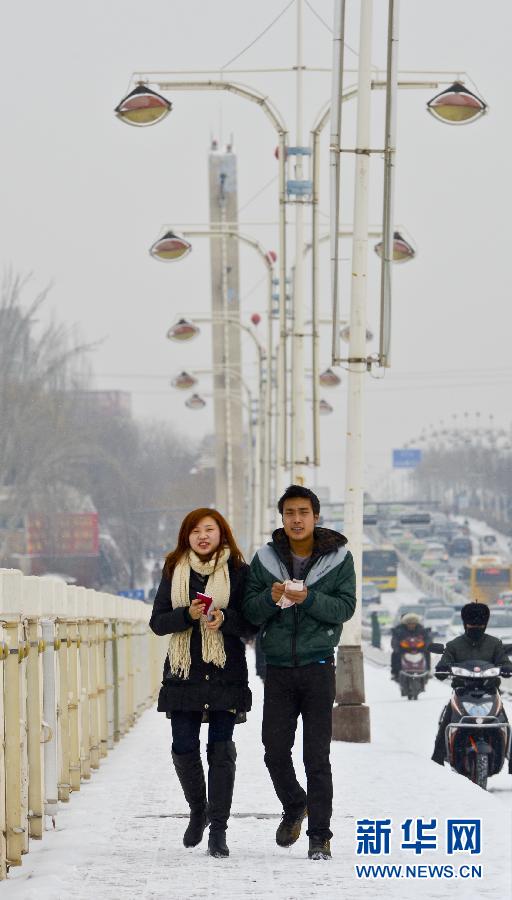 1月8日,在喀什市一条街道上,市民踏雪前行。当日,地处新疆塔克拉玛干大沙漠西缘的喀什市降下新年初雪。 新华社记者 赵戈 摄