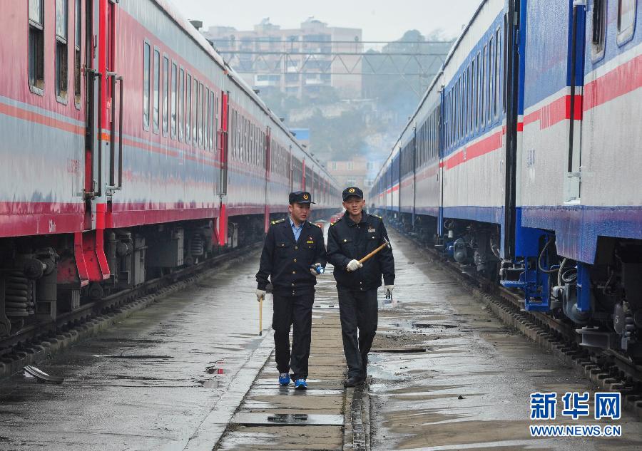1月8日,谭万军(右)与儿子谭帮建从待检修的列车旁经过。 新华社记者欧东衢摄