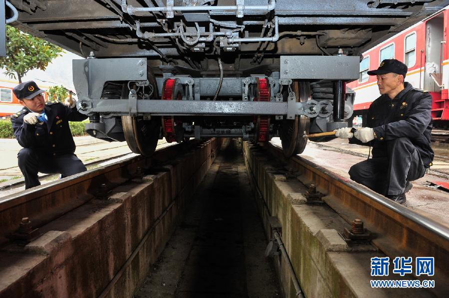 1月8日,谭万军(右)与儿子谭帮建在检修列车。新华社记者欧东衢摄