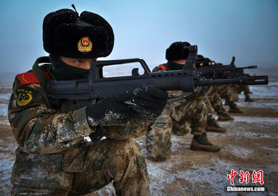 1月7日,新疆喀什地区室外温度已经降至零下10摄氏度,新疆边防总队机动支队将官兵拉进雪地戈壁进行技战术训练。据介绍,该机动部队在野外进行了战术基础动作、小组协同、实弹射击、长途奔袭、基础体能等多个科目的训练,以适应多种天候的作战环境。图为跪姿固定目标射击训练。柯大为 摄