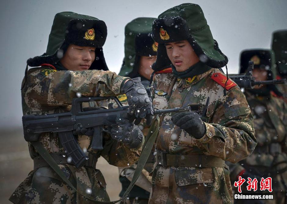 1月7日,新疆喀什地区室外温度已经降至零下10摄氏度,新疆边防总队机动支队将官兵拉进雪地戈壁进行技战术训练。据介绍,该机动部队在野外进行了战术基础动作、小组协同、实弹射击、长途奔袭、基础体能等多个科目的训练,以适应多种天候的作战环境。图为班长在纠正动作。柯大为 摄