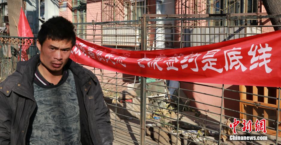 1月8日,一位路人从写有拆迁标语的条幅前经过。中新社发 刘关关 摄