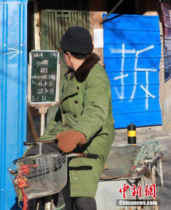 1月8日,一位路人回望写有“拆”字的房屋。中新社发 刘关关 摄