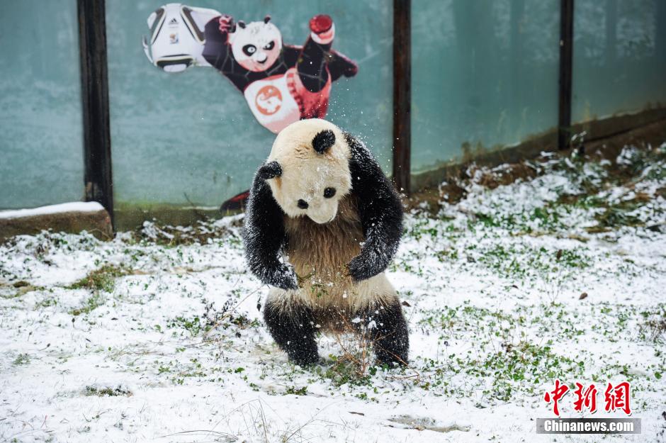 1月13日,云南野生动物园的大熊猫在雪地里秀“功夫”。当日,受冷空气影响,昆明降下了2014年第一场雪,这是春城今年冬天的第二次降雪。饲养员介绍,熊猫比较怕热,下雪天对它们来说才是真正的好天气。中新社发 刘冉阳 摄