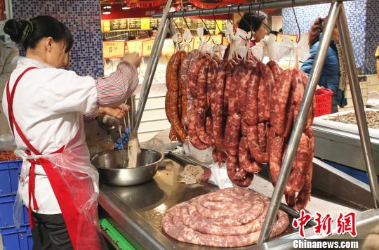 图为重庆一超市里,工人正在现场制作香肠。 周毅 摄