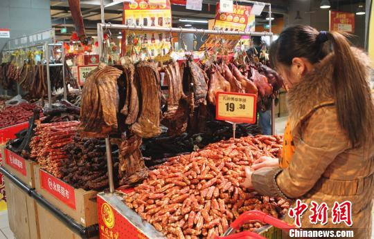 图为重庆一超市里,市民正在买香肠准备年货。 周毅 摄