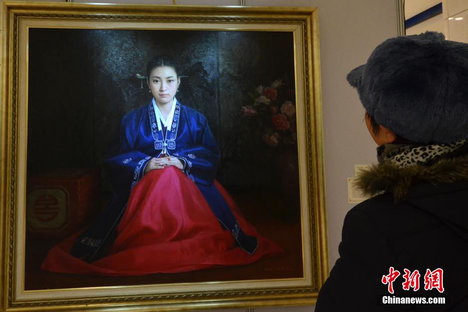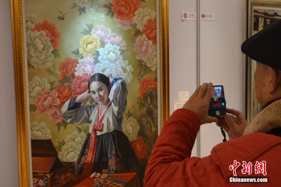 1月13日,朝鲜当代油画展在苏州举行,展出的46幅油画作品集中展现了朝鲜的风土人情,吸引了众多市民前来欣赏。中新社发 王思哲 摄