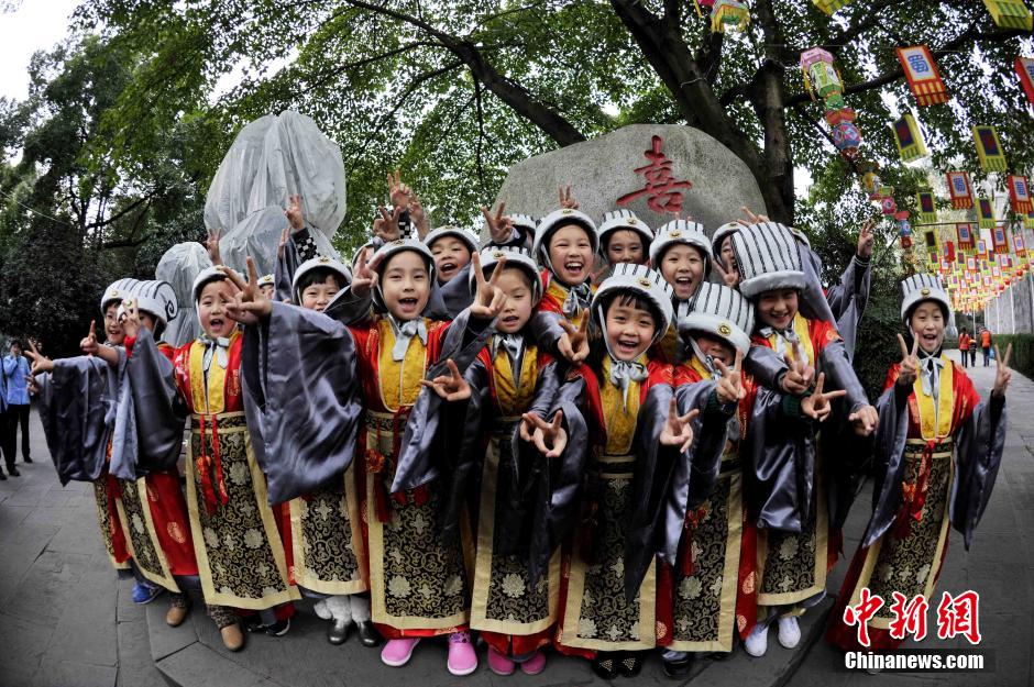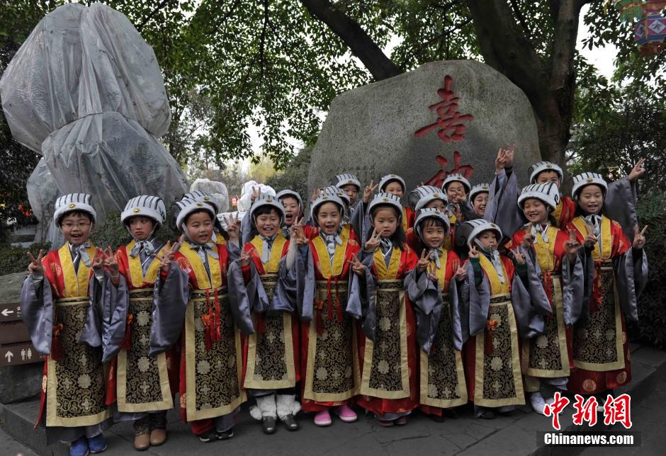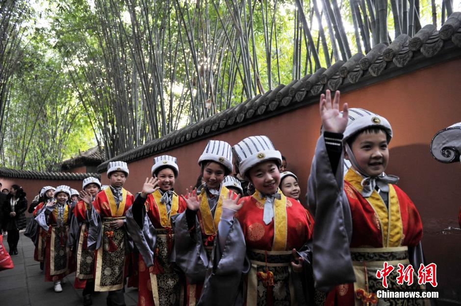 1月12日,20名喜气可爱的小朋友从三百多名报名者中脱颖而出,正式当选为2014成都大庙会的“国学小喜神”。中新社发 安源 摄