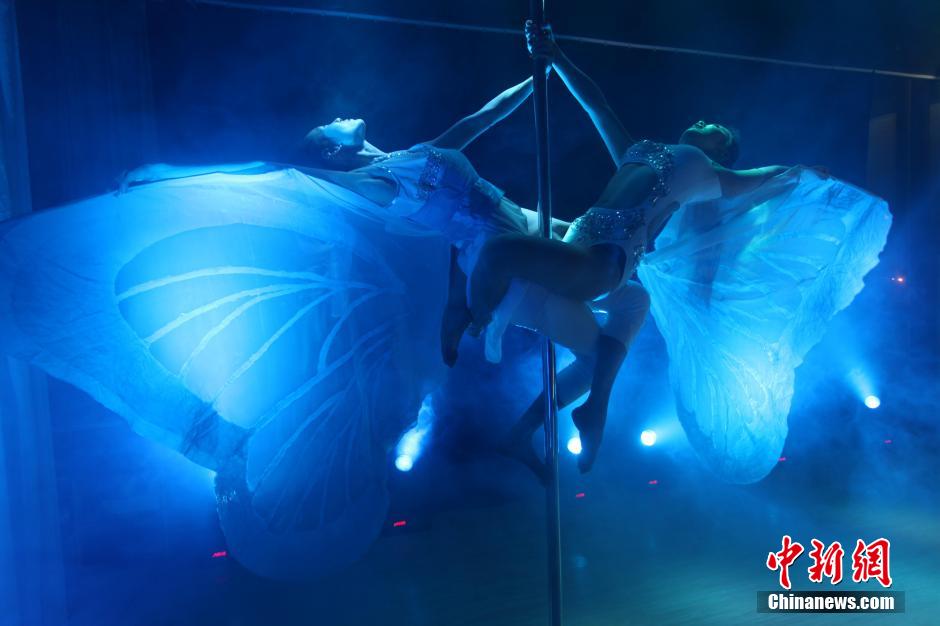 2014世界钢管舞锦标赛日益临近,1月14日凌晨,参赛此次世锦赛双人项目的中国国家队队长依繁及队员钟茜乐联手演绎的空中剧目《化蝶》在天津中国钢管舞运动训练中心进行彩排。据了解,钢管上演绎融入中国古典元素的《化蝶》,是舞台艺术中效果最好的一种诠释方式,也是钢管舞国家队创编的钢管舞剧中经典剧目。 中新社发 钟欣 摄
