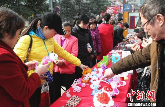 图为邓阿姨的手工制品吸引众多市民围观。周毅 摄