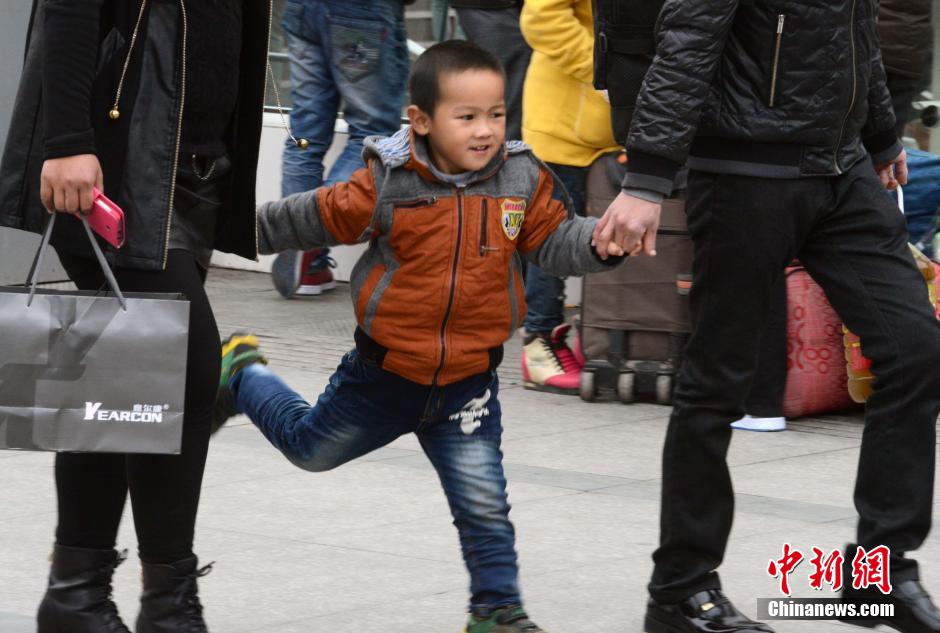 1月14日,距离2014年中国春运正式启幕仅剩2天,福州火车站广场候车的旅客比往日趋增,其中不少是跟随在闽务工的父母准备乘火车返乡过春节的“小候鸟”。图为一名男童牵着父母的手,快乐踏上返乡旅途。中新社发 刘可耕 摄