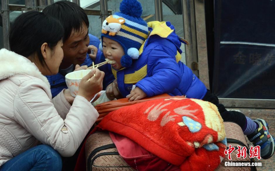 1月14日,距离2014年中国春运正式启幕仅剩2天,福州火车站广场候车的旅客比往日趋增,其中不少是跟随在闽务工的父母准备乘火车返乡过春节的“小候鸟”。图为候车的江西籍在榕务工张姓男子,给二岁的儿子喂饭。中新社发 刘可耕 摄
