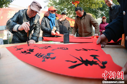 1月15日,安徽合肥贾大郢社区义务给回迁小区居民送春联。中新社发 张娅子 摄