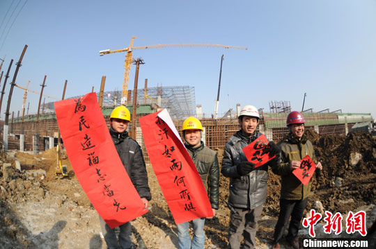1月15日,安徽合肥高铁南站建设工地上农民工领到合肥市沁心湖社区书法爱好者送来的春联。中新社发 张娅子 摄
