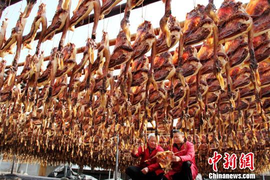 1月15日,江西省遂川县珠田乡天景湖板鸭厂员工在检查板鸭晒制情况。李建平 摄
