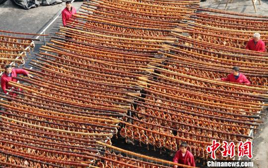 1月15日,江西省遂川县珠田乡天景湖板鸭厂员工在检查板鸭晒制情况。李建平 摄