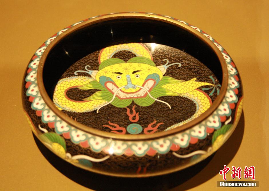 1月15日,出自中国清代的龙纹珐琅笔洗在浙江杭州工艺美术博物馆首度亮相。当天,95件中国清代皇室及民间珐琅精品在该馆展出。展品中,一对“画珐琅·绘西洋人物风景双耳瓶”更是乾隆帝当年的“心头宝”。中新社发 李晨韵 摄