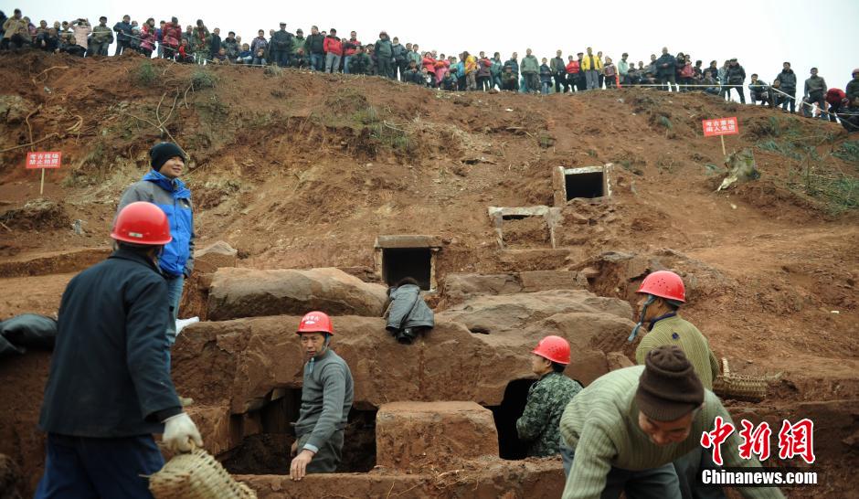 1月15日,四川仁寿富加镇发现的一宋代时期古墓考古发掘正在紧张进行中。古墓为双室石室墓,其中一墓室左右两侧刻精美武士、另外一墓内还有仙鹤等浮雕,墓内一石板上还刻有文字。古墓系当地在修建公路时发现。四川文物考古研究院专家表示,古墓内的浮雕和文字等对研究当地的民俗、文化等方面具有较高历史价值。图为古墓考古吸引了附近上千民众围观。中新社发 刘忠俊 摄