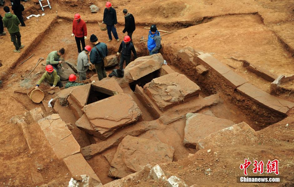 1月15日,四川仁寿富加镇发现的一宋代时期古墓考古发掘正在紧张进行中。古墓为双室石室墓,其中一墓室左右两侧刻精美武士、另外一墓内还有仙鹤等浮雕,墓内一石板上还刻有文字。古墓系当地在修建公路时发现。四川文物考古研究院专家表示,古墓内的浮雕和文字等对研究当地的民俗、文化等方面具有较高历史价值。图为古墓考古发掘现场。中新社发 刘忠俊 摄