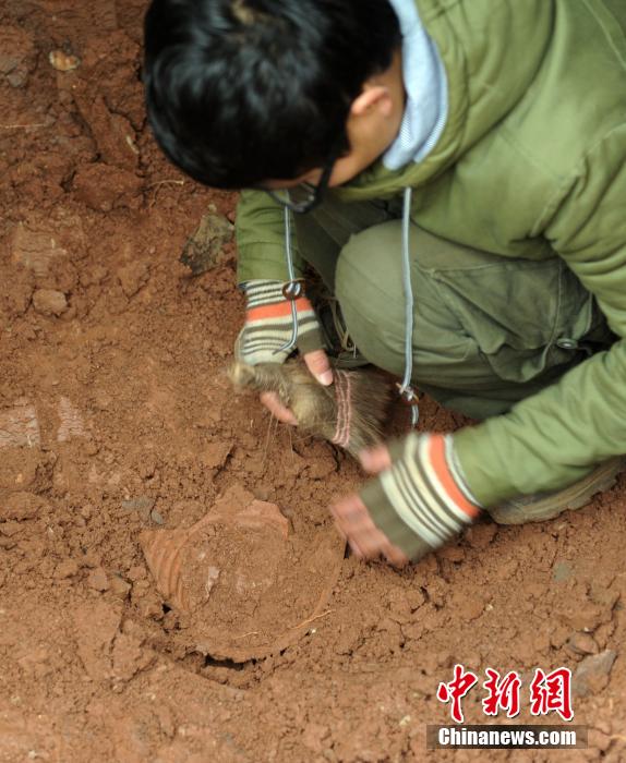 1月15日,四川仁寿富加镇发现的一宋代时期古墓考古发掘正在紧张进行中。古墓为双室石室墓,其中一墓室左右两侧刻精美武士、另外一墓内还有仙鹤等浮雕,墓内一石板上还刻有文字。古墓系当地在修建公路时发现。四川文物考古研究院专家表示,古墓内的浮雕和文字等对研究当地的民俗、文化等方面具有较高历史价值。图为考古人员在古墓内发现残缺的陶罐。中新社发 刘忠俊 摄