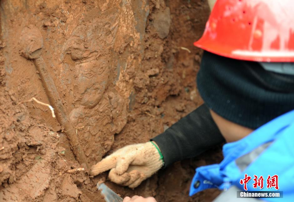 1月15日,四川仁寿富加镇发现的一宋代时期古墓考古发掘正在紧张进行中。古墓为双室石室墓,其中一墓室左右两侧刻精美武士、另外一墓内还有仙鹤等浮雕,墓内一石板上还刻有文字。古墓系当地在修建公路时发现。四川文物考古研究院专家表示,古墓内的浮雕和文字等对研究当地的民俗、文化等方面具有较高历史价值。图为考古人员在古墓内发现精美浮雕。中新社发 刘忠俊 摄