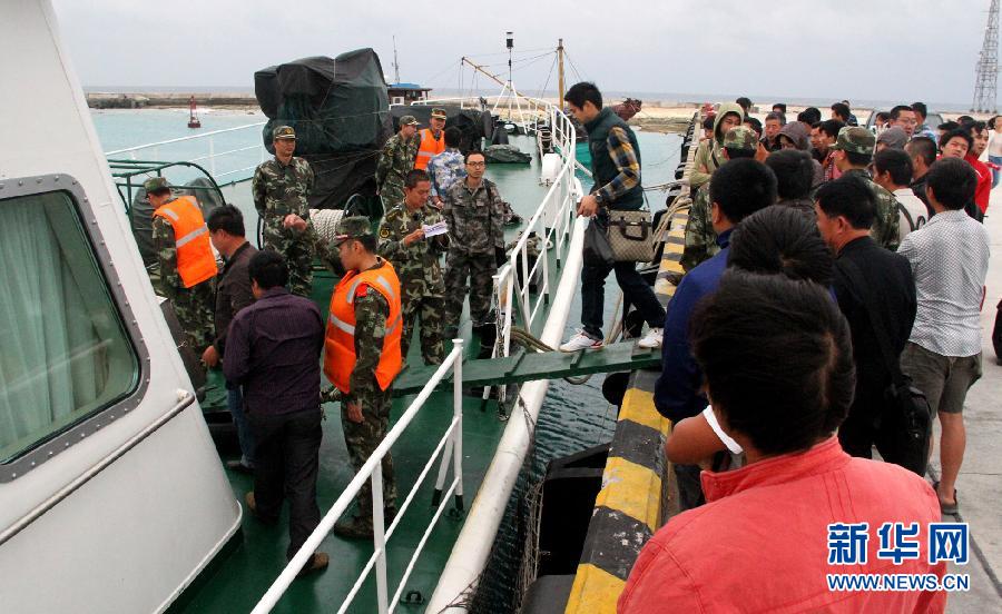 1月17日,农民工在永兴岛综合码头登船准备返乡。海南省三沙市边防辖区地处偏僻、交通不便,近日受寒潮影响,当地农民工返乡受阻。为方便农民工回家过年,三沙市公安边防支队官兵主动深入永兴岛、琛航岛、晋卿岛等建设工地,对需要返乡的农民工进行摸底登记,并协调海警船帮助75名农民工顺利返乡。新华社发 (蔚涛泽 摄)