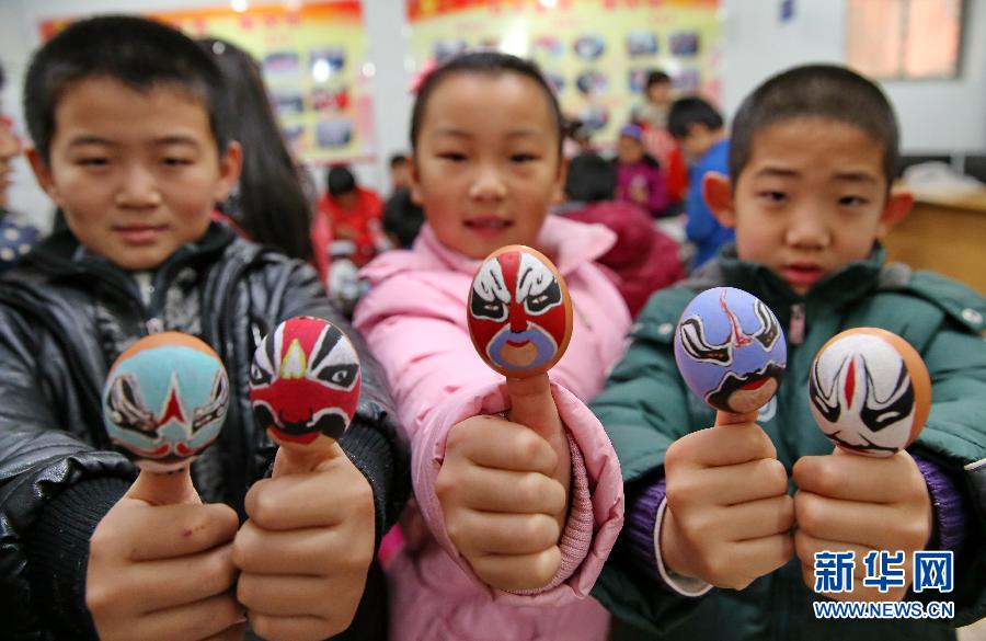 1月17日,秦皇岛市团结里社区的孩子们在社区文化中心展示自己画的蛋壳脸谱。为让孩子们过一个快乐的寒假,河北省秦皇岛市团结里社区近日在社区文化中心开设蛋壳画培训班,免费教孩子学画蛋壳脸谱。 新华社记者杨世尧摄