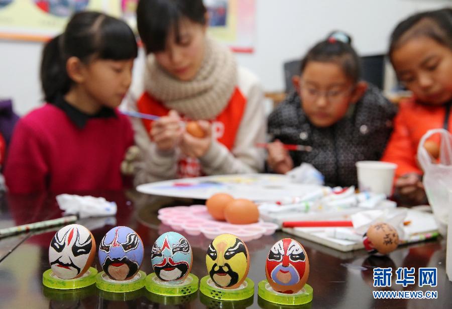 1月17日,秦皇岛市团结里社区的孩子们在社区文化中心学画蛋壳脸谱。为让孩子们过一个快乐的寒假,河北省秦皇岛市团结里社区近日在社区文化中心开设蛋壳画培训班,免费教孩子学画蛋壳脸谱。 新华社记者杨世尧摄