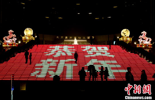 1月16日晚,马年春节将至,北京街头夜色中流露出浓浓的节日气息。中新社发 杜洋 摄