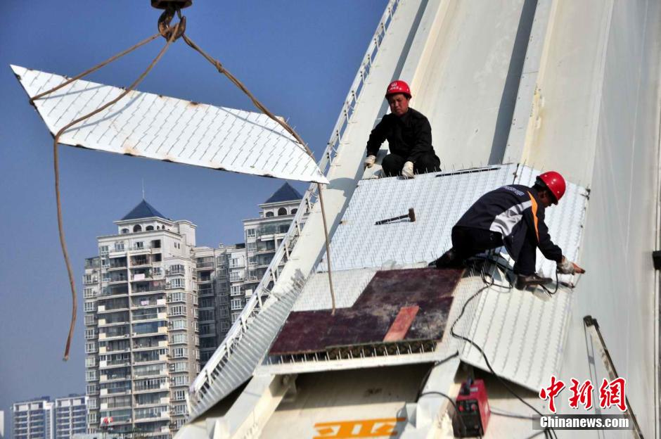 1月16日,在广西柳州市新建成的广雅大桥上,施工人员在桥拱焊接“铁钉阵”,以防有人爬上桥拱轻生或者上演“跳桥秀”。近年,因讨薪、感情纠纷等原因,时常发生有人爬上作为城市交通主干道的大桥桥拱上挂横幅、轻生事件,并造成这些城市交通瘫痪。木子 摄