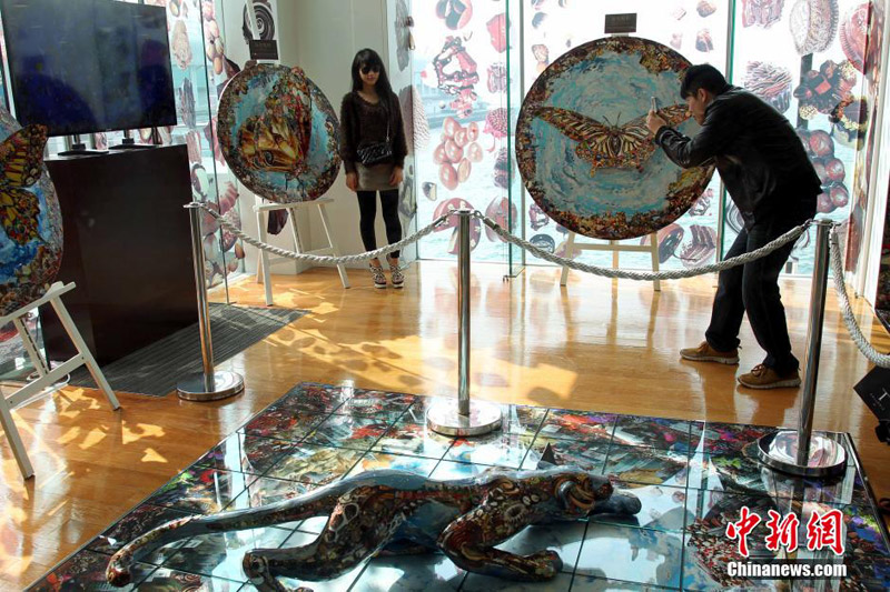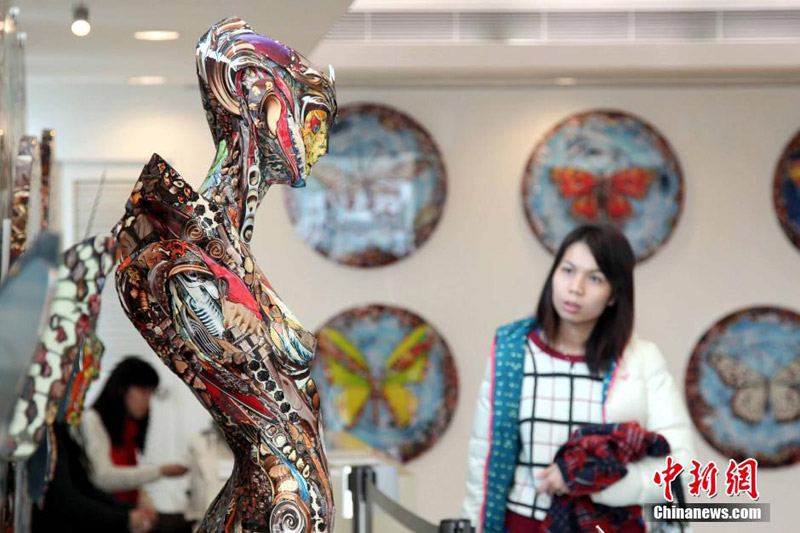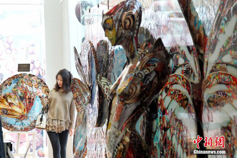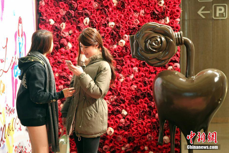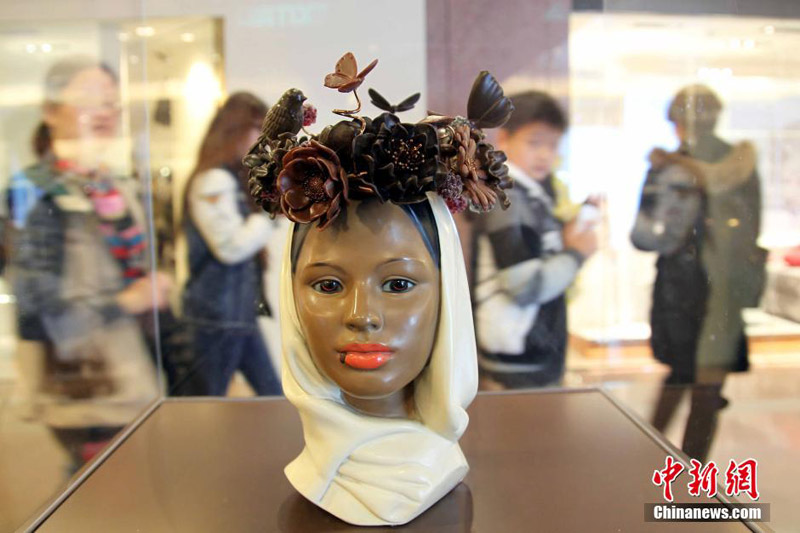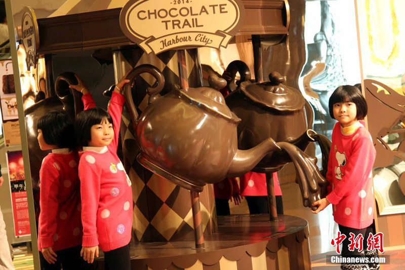 1月17日,朱古力艺术展吸引小朋友留影。香港海港城由1月13日至2月16日举办第五届“情·寻朱古力”展。适逢2014年2月14日是每逢19年“邂逅”一次的中西情人节,朱古力添上浪漫的感觉,展览以“Romance is everything”为题,让人人都走进朱古力浪漫的甜蜜国度。中新社发 洪少葵 摄