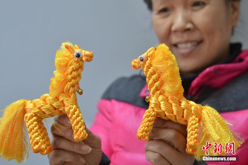 农历马年新春将至,1月19日,数十只用各种彩色绳线编制而成“神(绳)马”亮相苏州,活灵活现的站立着,憨态可掬。据了解,这些“神(绳)马”是由苏州市民沈建华利用空余时间制作而成,作为送给亲朋好友的新年礼物,很受青睐。图为沈建华展示一对“神马”。王思哲 摄