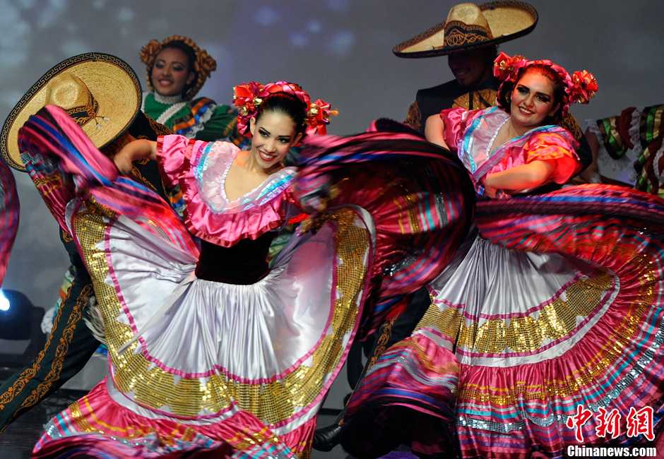 当地时间1月18日晚,一台融合中国文化和西方风情的“北美2014欢乐春节”好莱坞中国新年晚会在洛杉矶比佛利山希尔顿酒店举行,数百名各族裔民众欢聚一堂,庆祝中国传统新年的到来。图为墨西哥舞蹈“拉丁嘉年华”。中新社发 毛建军 摄