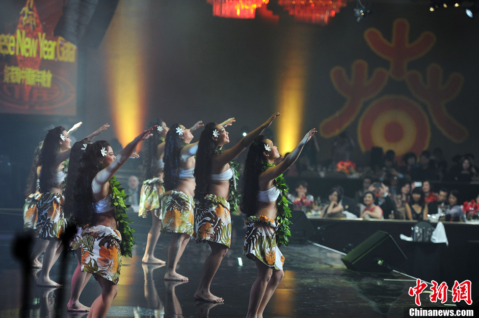 当地时间1月18日晚,一台融合中国文化和西方风情的“北美2014欢乐春节”好莱坞中国新年晚会在洛杉矶比佛利山希尔顿酒店举行,数百名各族裔民众欢聚一堂,庆祝中国传统新年的到来。图为夏威夷风情舞蹈。中新社发 毛建军 摄