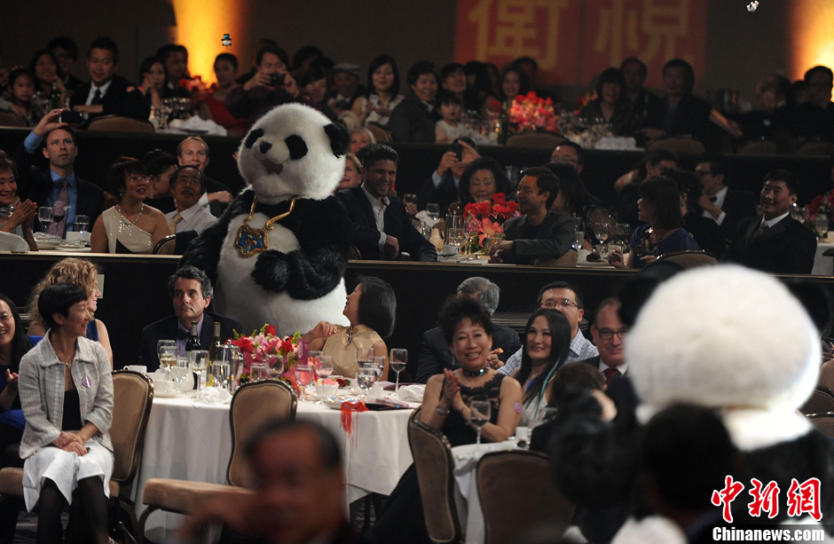 当地时间1月18日晚,一台融合中国文化和西方风情的“北美2014欢乐春节”好莱坞中国新年晚会在洛杉矶比佛利山希尔顿酒店举行,数百名各族裔民众欢聚一堂,庆祝中国传统新年的到来。图为正在拉斯维加斯威尼斯宫殿剧院驻场演出的《PANDA!》前来助兴。中新社发 毛建军 摄