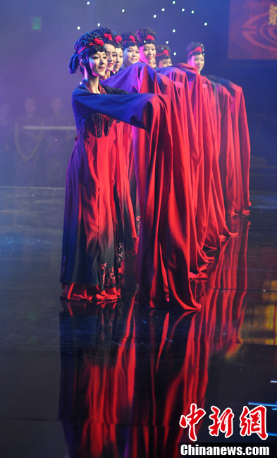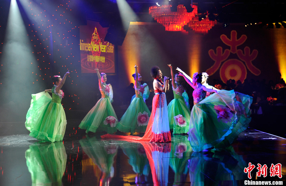 当地时间1月18日晚,一台融合中国文化和西方风情的“北美2014欢乐春节”好莱坞中国新年晚会在洛杉矶比佛利山希尔顿酒店举行,数百名各族裔民众欢聚一堂,庆祝中国传统新年的到来。图为身着中国传统服饰的“洋娃娃”登台舞新年。中新社发 毛建军 摄