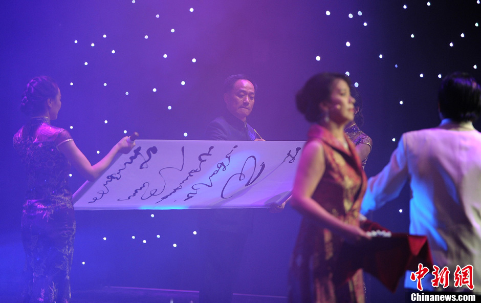 当地时间1月18日晚,一台融合中国文化和西方风情的“北美2014欢乐春节”好莱坞中国新年晚会在洛杉矶比佛利山希尔顿酒店举行,数百名各族裔民众欢聚一堂,庆祝中国传统新年的到来。图为书法家王汉光现场悬书《水调歌头》。中新社发 毛建军 摄