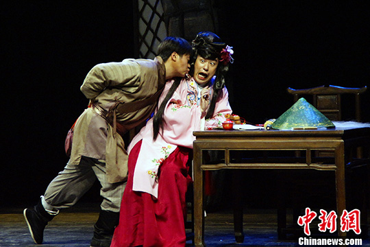 1月19日晚间,古装爆笑喜剧《三人成“唬”》在天津人艺实验剧场上演,此剧是由天津人艺·大度戏剧工作室独家创作的首部古装爆笑喜剧,讲述了一个跟“谣言”有关的故事。中新社发 张道正 摄