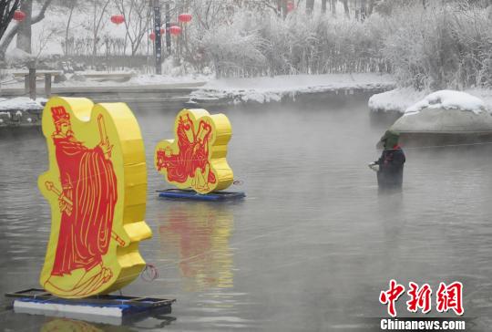 观花灯是春节娱乐项目之一。1月20日,工人们正在乌鲁木齐市水磨沟公园的水磨河中安装花灯,为市民春节观灯忙活着。马新龙 摄