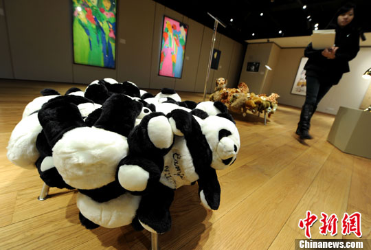 1月20日,香港展出坎帕纳兄弟的艺术品《熊猫椅》,作者运用熊猫毛绒玩具创作出颇具趣味及活力的椅子。中新社发 张宇 摄