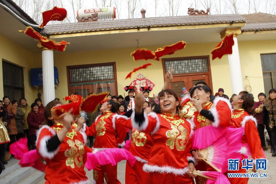 1月20日,河南省内黄县城关镇王小汪村的农民演员在排练“村晚”舞蹈“开门红”。春节临近,河南省安阳市内黄县城关镇王小汪村的村名自发组织的“农民春晚”正在紧张筹备中,村民们自编自导了20余个源自生活的舞蹈、时装秀、情景剧、戏曲等节目。村民把旧衣服、被面、破布条等改装成演员的服饰,把农家现成的粮食、农具、炊具全都搬上了舞台,自己办一场既节俭又热闹的“农民春晚”。新华社发(刘肖坤 摄)