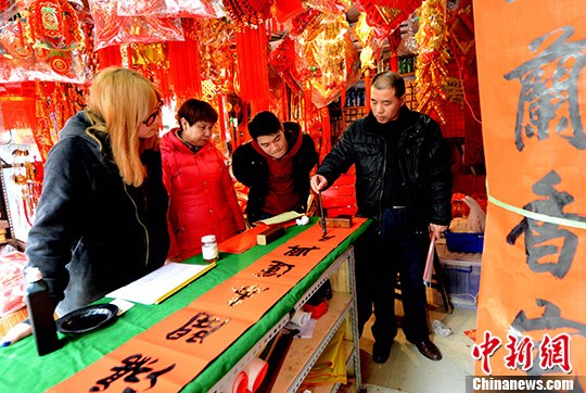 1月20日,福州鼓西路春节饰品一条街上,根据市民需求“私人订制”的手写春联备受青睐。春节临近,福州春节饰品、花灯等年饰市场日渐红火。中新社发 刘可耕 摄