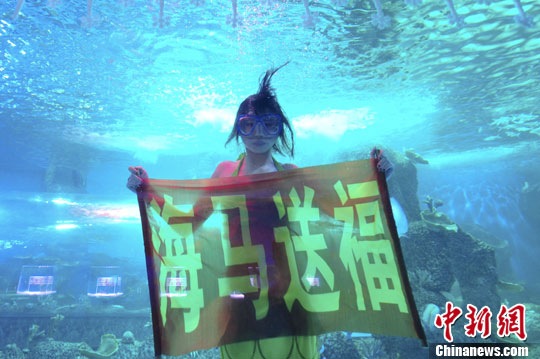 1月20日,海马“驾临”济南大明湖海底世界一展芳容,并“委托”扮作“美人鱼”的美女向游客送去马年祝福。中新社发 张勇 摄